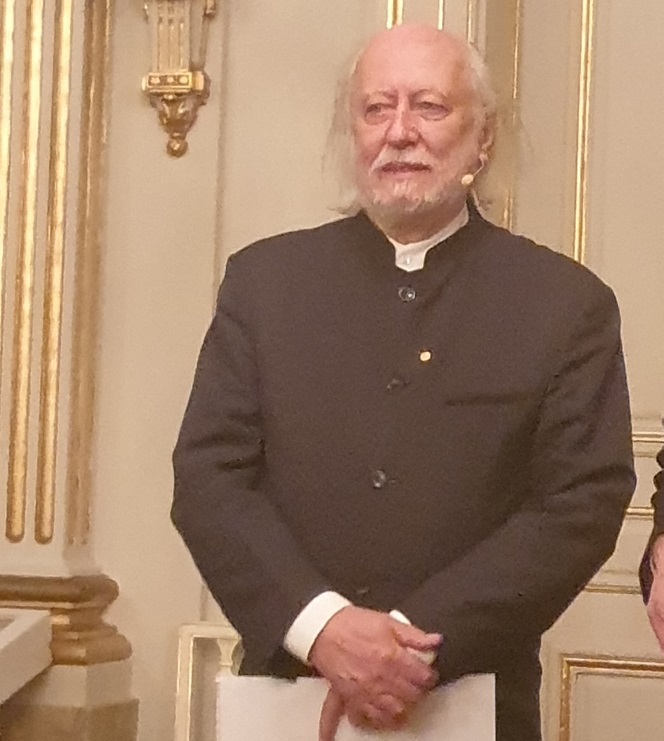 A las 16:55 hrs. entraron los miembros de la Academia Sueca, se sentaron en sus respectivas sillas situadas frente a la tarima desde donde el laureado iba a dar su discurso. Un silencio compacto se apoderó del salón. No se movía ni un alfiler. Solo miradas se cruzaban esperando al ganador del premio más famoso del mundo. Y a la hora indicada en punto se abrió una puerta. László Krasznahorkai flanqueado por Mats Malm, secretario permanente de la academia, aparecieron como dos personajes caminando en la casa de Alfred Nobel. El público, de pie, observaba al galardonado, y los aplausos estallaron como una ola incontenible, cálidos y prolongados. Krasznahorkai vestido de traje negro, camisa blanca y zapatos marrones andaba con la lentitud deliberada de quien ha medido muy bien cada paso. Acto seguido, Malm tomó la palabra para dar la bienvenida al flamante coronado con el Premio Nobel de Literatura. A continuación, el pianista, Pontus Carron, interpretó piezas de Johann Sebastian Bach y de György Kurtág. Finalmente, Krasznahorkai se levantó de su asiento para dirigirse a la tarima, y empezó a leer su discurso, en húngaro, con las siguientes palabras: «En relación con este Premio Nobel, quería compartir mis pensamientos con ustedes sobre la esperanza; pero para mí, la esperanza finalmente ha llegado a su fin. Por eso hablaré, ahora, sobre los ángeles».