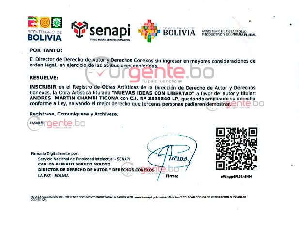 “Inscribir en el Registro de Obras Artísticas de la Dirección de Derecho de Autor y Derechos Conexos, la Obra Artística titulada "Nuevas Ideas Con Libertad" a favor del autor y titular Andrés Martin Chambi Ticona con C.І. № 3339840 LP, quedando amparado su derecho conforme a Ley, salvando el mejor derecho que terceras personas pudieren demostrar”, se lee en el documento.