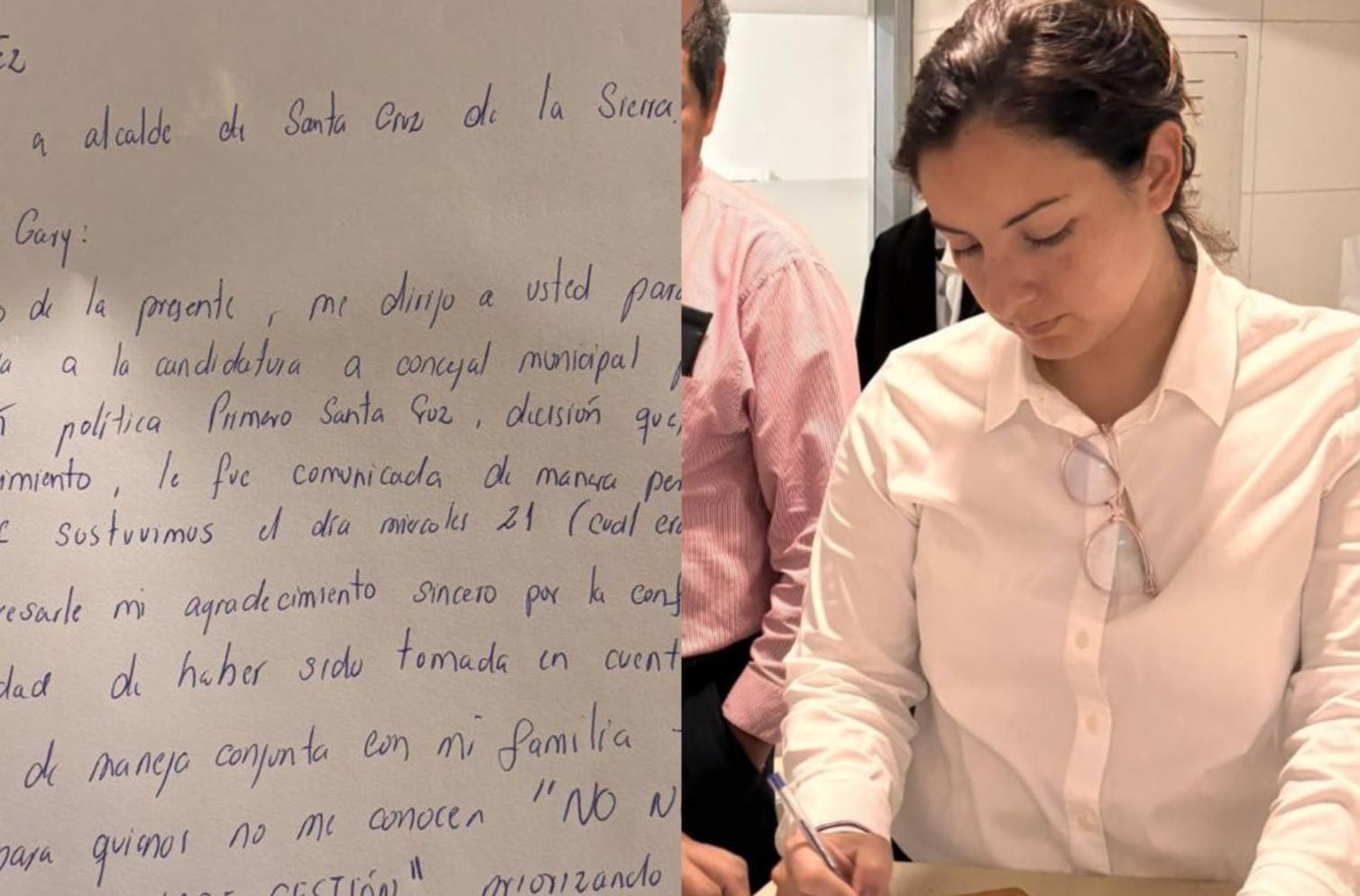 “Por medio del presente, me dirijo a usted para formalizar mi renuncia a la candidatura a concejal municipal”, se menciona en la primera parte de la carta, dirigida a Gary Añez, candidato a la Alcaldía cruceña.