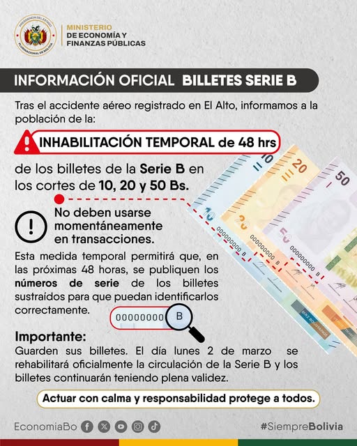 Horas después de que el Banco Central de Bolivia informó que todos los billetes de la serie B, en los cortes de Bs 10, Bs 20 y Bs 50 dejan de tener validez legal, el Ministerio de Economía y Finanzas Públicas informó la tarde de este sábado que “la inhabilitación de los billetes de la Serie B es una medida de carácter temporal por un lapso de 48 horas”.