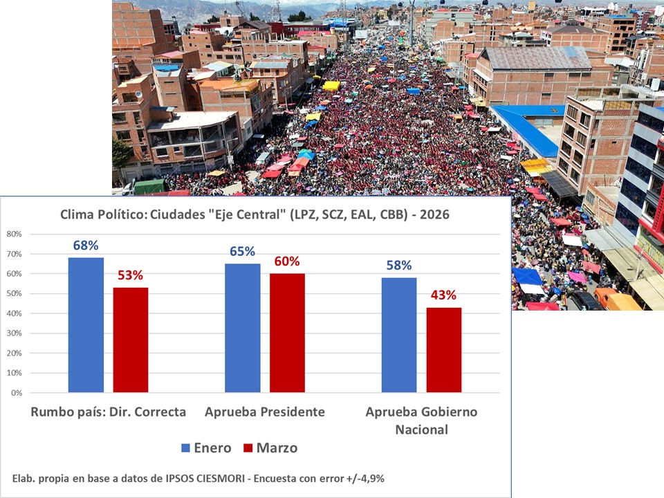 Hay actualmente señales que esa fase se acabó. Lo primero que se erosionó fue el optimismo moderado con el que se juzgaba la coyuntura: en la encuesta de IPSOS CIESMORI, el porcentaje de persona de las ciudades del eje que dicen que el país va por “un rumbo correcto” disminuyó del 68% al 53% desde enero y en la ciudad de El Alto y Cochabamba los pesimistas ya son hoy más numerosos que los optimistas. Y esto está sucediendo en lugares donde los segmentos medios son mayoritarios.