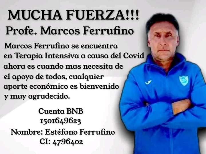 18 de junio (Urgente.bo).- El exfutbolista y director técnico de Oruro, Marco Ferrufino, contrajo coronavirus y su salud se complicó al punto de ser internado en terapia intensiva, porque casi el 90% de sus pulmones están comprometidos.