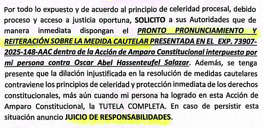 Terrazas pide que las autoridades del TCP tengan presente que ella logró la tutela completa en una acción de amparo constitucional en defensa de sus intereses como delegada titular por el MTS. Por eso, afirma que si el TCP no define medidas cautelares, “anuncio juicio de responsabilidades”.
