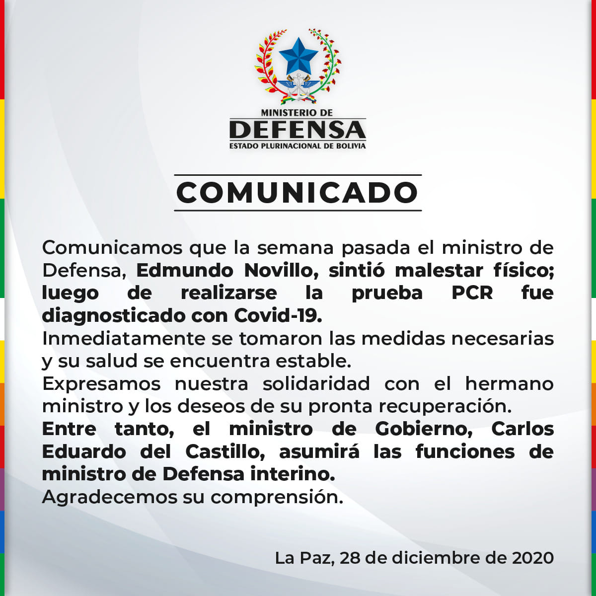 28 de diciembre (Urgente.bo).- A través de un comunicado, el Ministerio de Defensa informó la tarde de este lunes que el titular de esta cartera de Estado, Edmundo Novillo dio positivo a coronavirus.