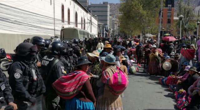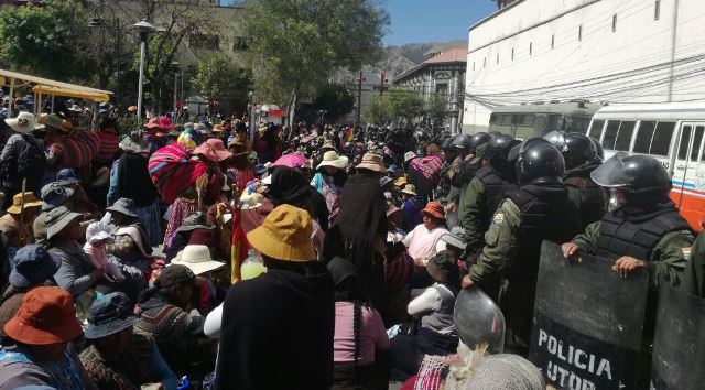 Poco después del mediodía, las mujeres de Achacachi, que descendieron desde la ciudad de El Alto y recorrieron por el centro, llegaron a proximidades de la cárcel, donde se encontraron con una barrera policial. Allí, las marchistas buscaron superar la barrera para protestas en las puertas del panóptico por la liberación del dirigente Condori.