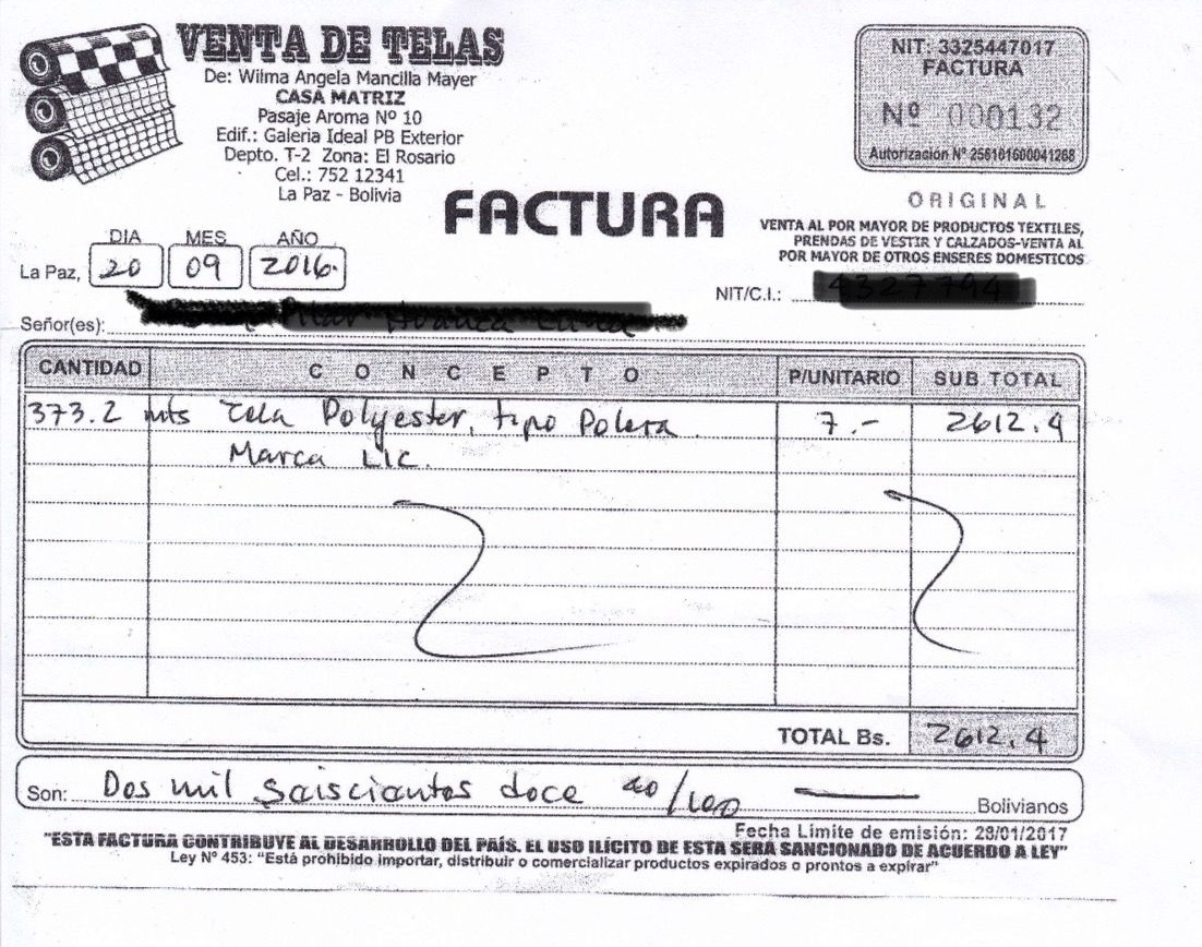 Rosa confió en que le devolverían su carga una vez presentada la factura, por lo que retornó a La Paz para solicitarla. Sin embargo, la comerciante de la Ceja se negó a entregarle la factura completa y solo le proporcionó la factura N.º 132 por un valor de 375 USD, fechada el 20 de septiembre de 2016, la cual Rosa presentó a la Aduana Nacional.
