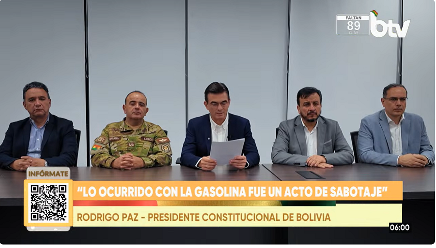 En un mensaje transmitido por redes sociales y medios oficiales, Paz aseguró que lo ocurrido con la gasolina no fue un error técnico ni impericia, “fue un acto deliberado de sabotaje”, “parte de un esquema interno que esta gestión empezó a detectar desde el primer día”.