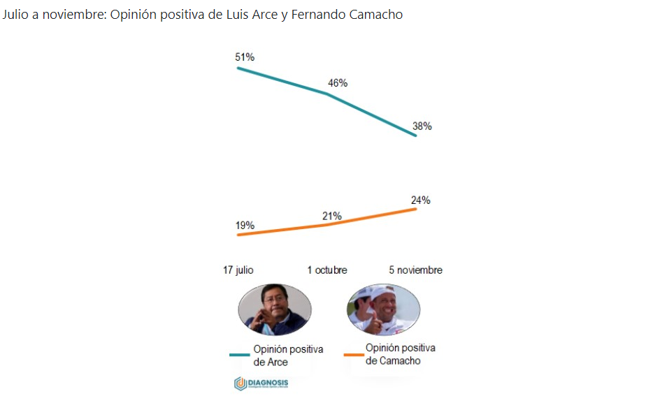 “El conflicto por el Censo y las disputas internas del MAS han significado una notable disminución del apoyo a los líderes del oficialismo (Arce, Choquehuanca y Evo). Al mismo tiempo, no se observa un incremento relevante en el apoyo a Fernando Camacho. Ni siquiera en Santa Cruz, donde se evidencia un cierto cansancio con su liderazgo”, dice Diagnosis.