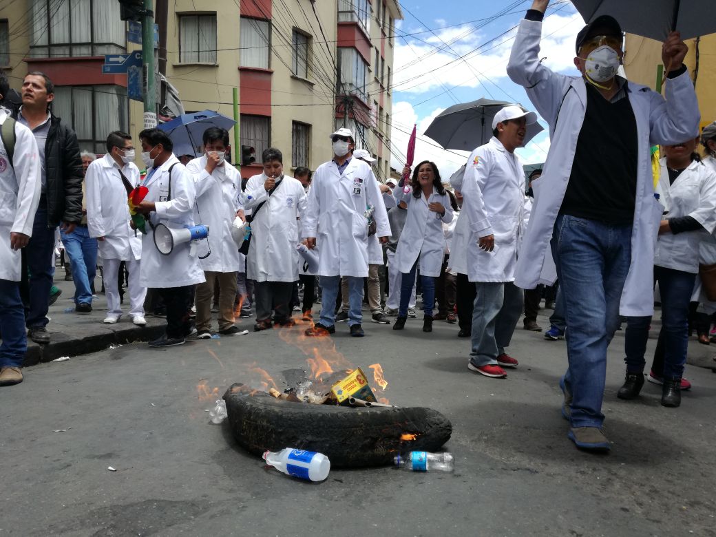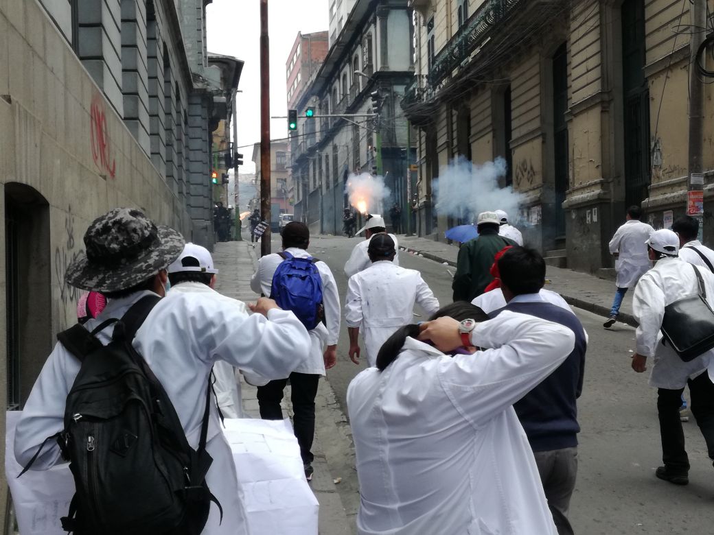 2.jpg La Paz, 19 de diciembre (Urgentebo) .- Estudiantes de medicina, trabajadores en salud intentaron ingresar a la plaza Murillo, debido a ello la Policía los gasifico. 1.jpg Sin embargo el sector de salud, se defendió usando petardos. ///