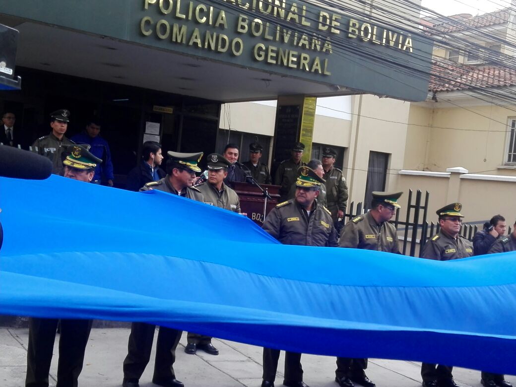 En un acto especial que se realizó en el Comando de la Policía, la principal autoridad de la institución verde olivo, Faustino Mendoza, mostró la bandera y dijo "estamos felices porque esta bandera se elaboró con mucho cariño".