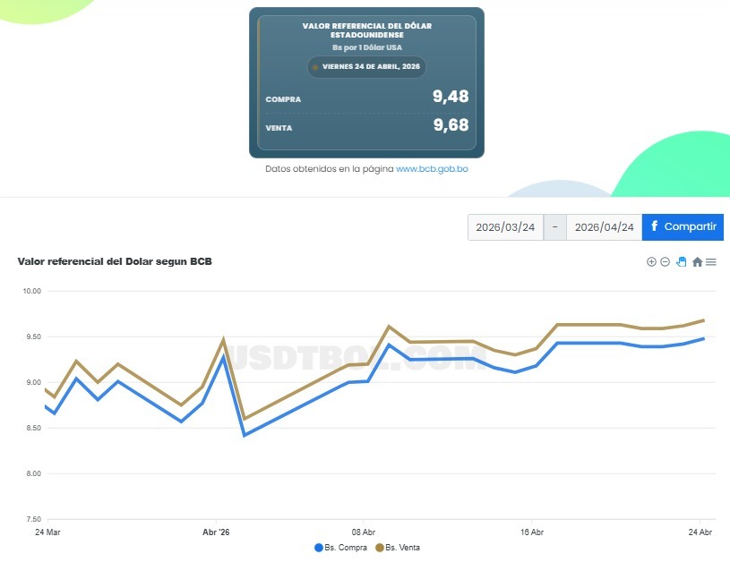 Este viernes 24 de abril, el tipo de cambio referencial del BCB alcanzo nuevamente su máxima cotización desde su creación (01/12/2025), llegando a la fecha a un precio de venta de Bs. 9,68 por 1 $us.