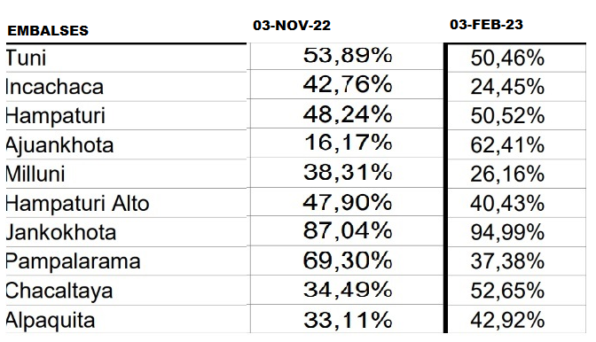 De acuerdo con los datos oficiales de EPSAS, la represa de Jank’okhota llegó a un nivel de almacenamiento del 95%, lo que significa de poco más de tres millones de metros cúbicos de agua. Luego se encuentra la presa de Ajuankhota , con el 62,41% de almacenamiento.