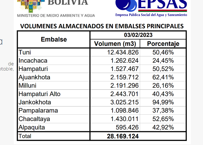 El ministro de Medio Ambiente y Agua, Juan Santos Cruz, y el Director de Agua Potable y Alcantarillado Sanitario, Orlando Reyes Llanque y el Interventor de EPSAS Bladimir Iraizos, verificaron la recuperación de los niveles de agua y se espera que en este mes y hasta mediados de marzo alcancen sus máximas capacidades de almacenamiento en las 10 represas.