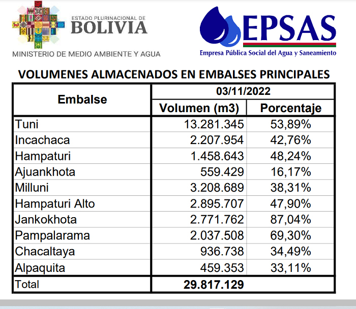 Las autoridades de EPSAS y del gobierno han destacado la mejora en el almacenamiento de agua en las 10 represas, pero han dicho con énfasis que no es suficiente.
