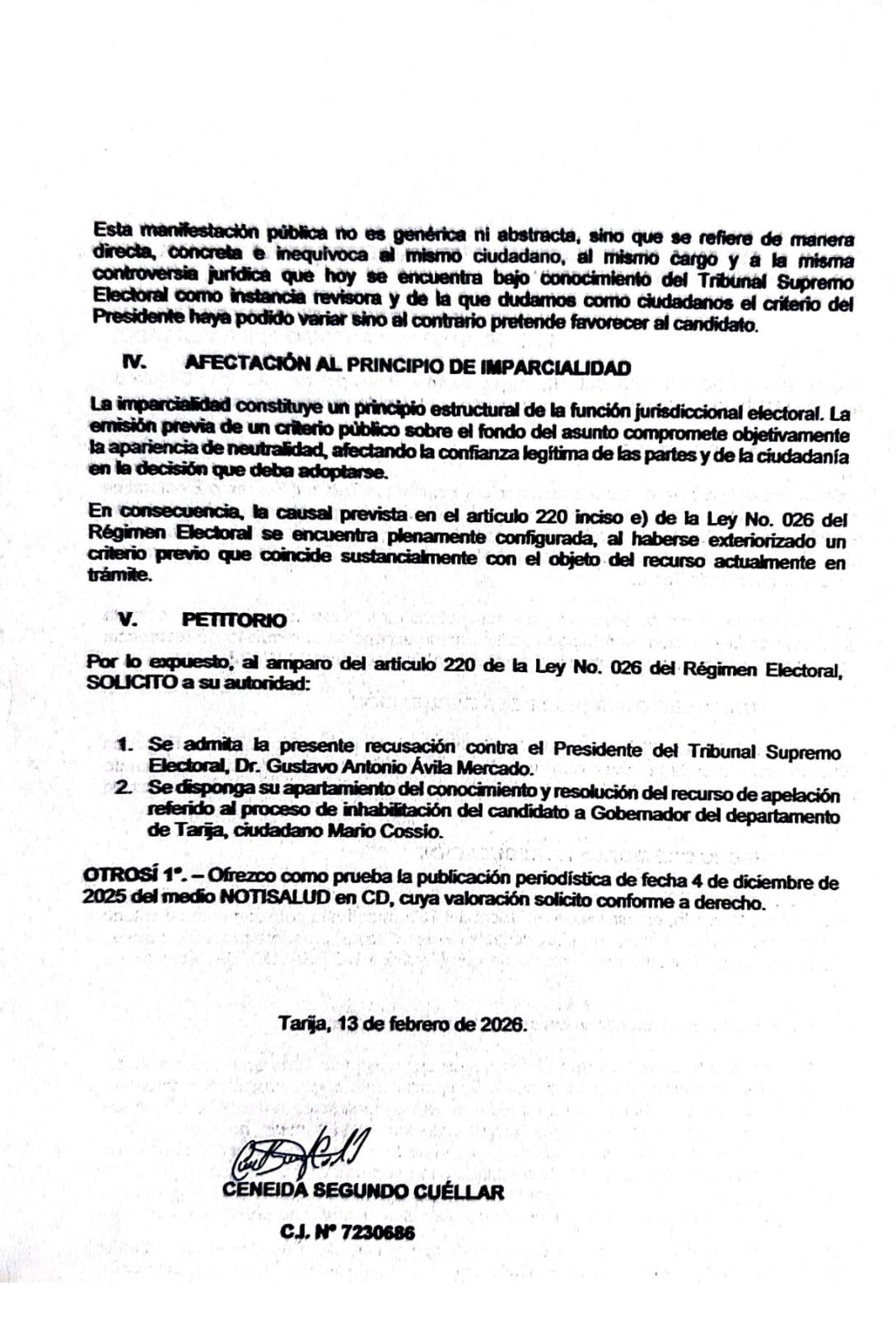 Según documentos al que accedió Urgente.bo, la pasada semana, Ceneida Segundo Cuéllar presentó la recusación para que el Presidente del TSE se abstenga de conocer y resolver la apelación vinculada al proceso de inhabilitación del candidato Cossío, argumentando que la autoridad habría emitido previamente una opinión pública sobre el caso.