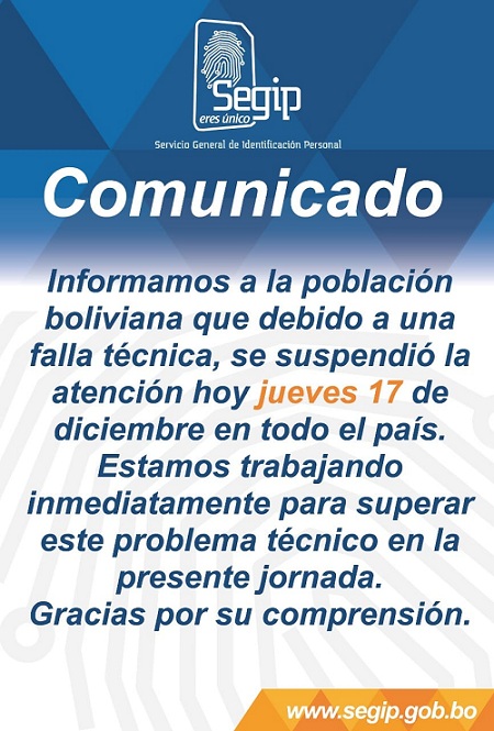 17 de diciembre (Urgente.bo).- Mediante un comunicado, el Servicio General de Identificación Personal (Segip) informó este jueves que debido a una falla técnica se suspendió la atención a la ciudadanía en todo el país.