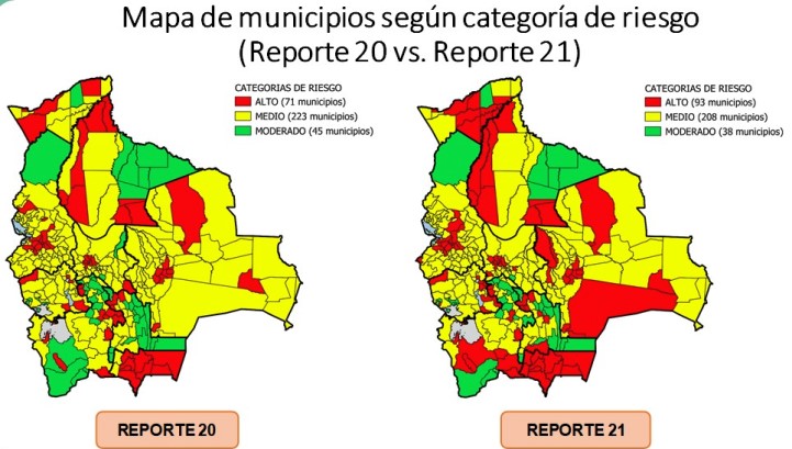 Mientras que dos municipios (El Villar y Colcha K) cambiaron su nivel moderado por riesgo alto y otros nueve (Monteagudo, Villa Abecia, Chimoré, Chayanta, Chuquiuta, Porco, Arampampa, Acasio y San Joaquín) pasaron de moderado a riesgo medio, debido a una expansión significativa en la velocidad de propagación del virus, señala el reporte oficial.