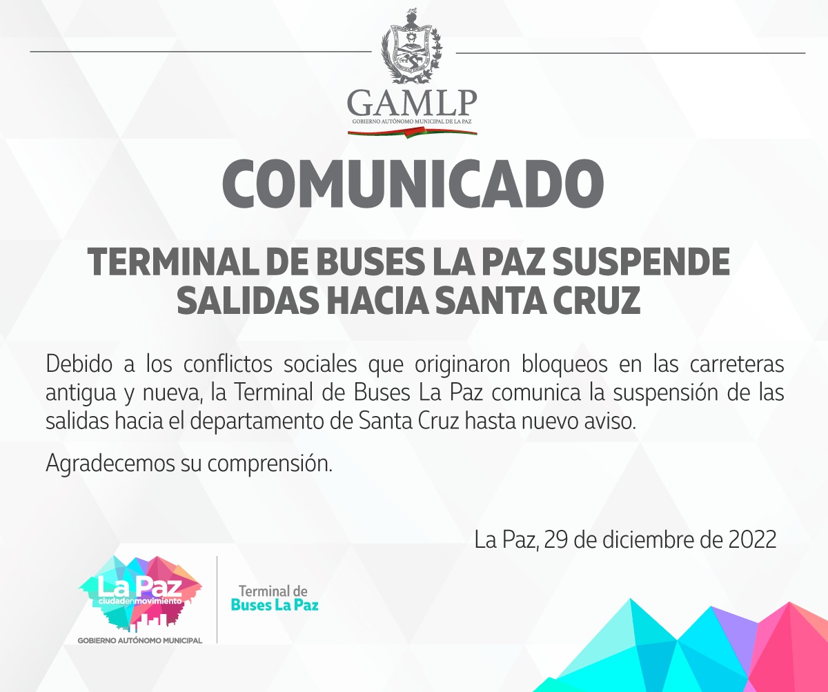 Debido a los bloqueos originados en Santa Cruz por la aprehensión del gobernador Luis Fernando Camacho, se han suspendido las salidas de buses hacia el oriente de la Terminal de Buses La Paz. Ayer cerca de las 20:00 ya se habían cerrado los caminos que conectan La Paz, Cochabamba y Santa Cruz.