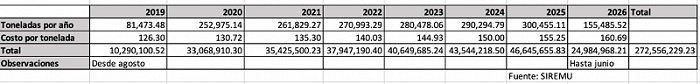 En ese sentido, las estimaciones realizadas por el por el Sistema de Regulación Municipal (SIREMU) sobre la base del contrato vigente hasta ayer dan cuenta que el 2020, Tersa iba a recibir la suma de 33 millones, el 2021, 35,4 millones; el 2022, la suma de 37.9 millones; el 2023; 40,6; el 2024, poco más de 43,5; el 2025; 46,6 millones y el 2026, casi 25 millones.