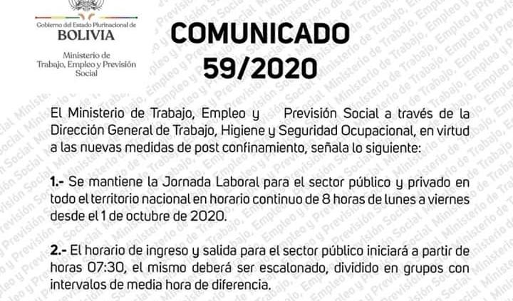 1 de octubre (Urgente.bo).- Mediante un comunicado, el Ministerio de Trabajo informó que se mantiene la jornada laboral de horario continuo con 8 horas de trabajo de lunes a viernes desde el 1 de octubre.