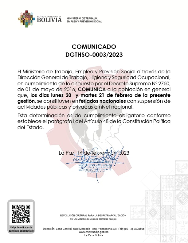 “Los días lunes 20 y martes 21 de febrero de la presente gestión, se constituyen en feriados nacionales con suspensión de actividades públicas y privadas”, señala dicho comunicado.