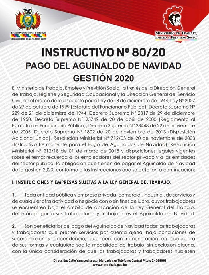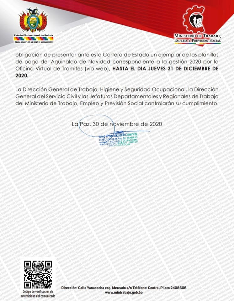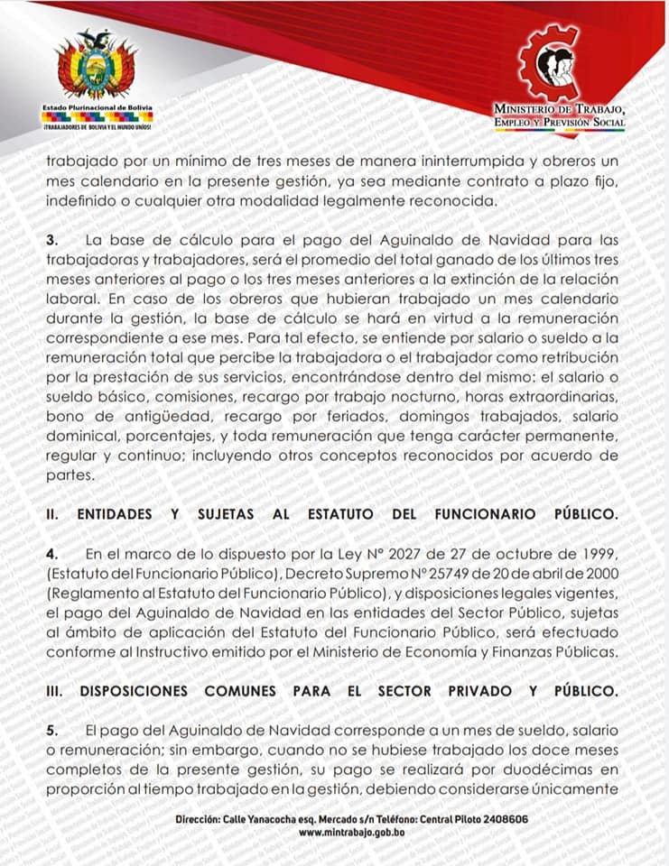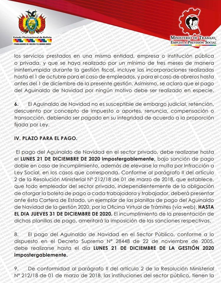 2 de diciembre (Urgente.bo).- El Ministerio de Trabajo emitió un instructivo en el que se establece que el aguinaldo por las fiestas de fin de año debe ser pagado de forma impostergablemente hasta el 21 de diciembre de este año.