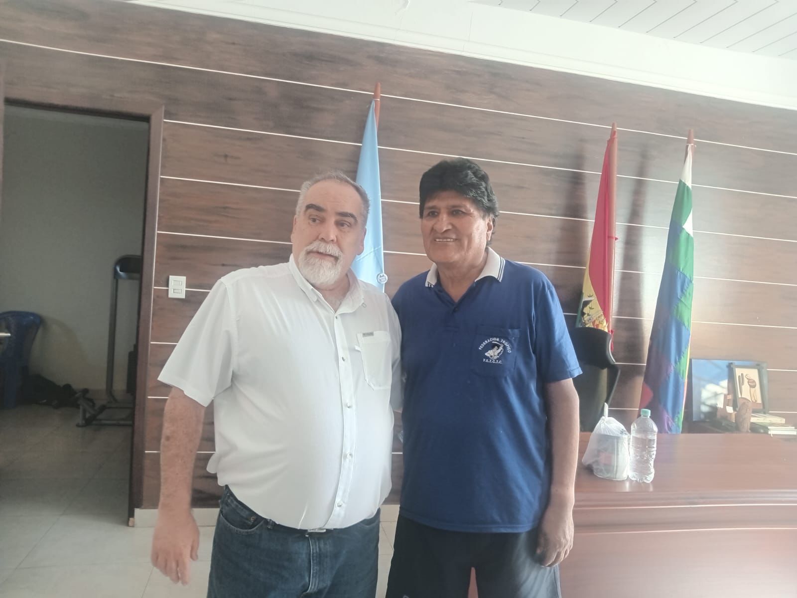 Evo viste una camisa azul, mientras que Subirana lleva una camisa blanca, la misma que utilizó este domingo cuando participó como invitado en el programa de Radio Kawsachun Coca (RKC).
