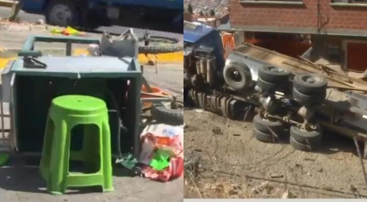 18 de julio (Urgente.bo).- La mañana de este lunes se registraron dos accidentes de tránsito en la ciudad de La Paz. El primero ocurrió en la zona de Llojeta, donde un micro impactó contra un puesto de comida y atropelló a dos personas. El segundo caso trata del vuelco de una cisterna en la Av. Max Fernández.