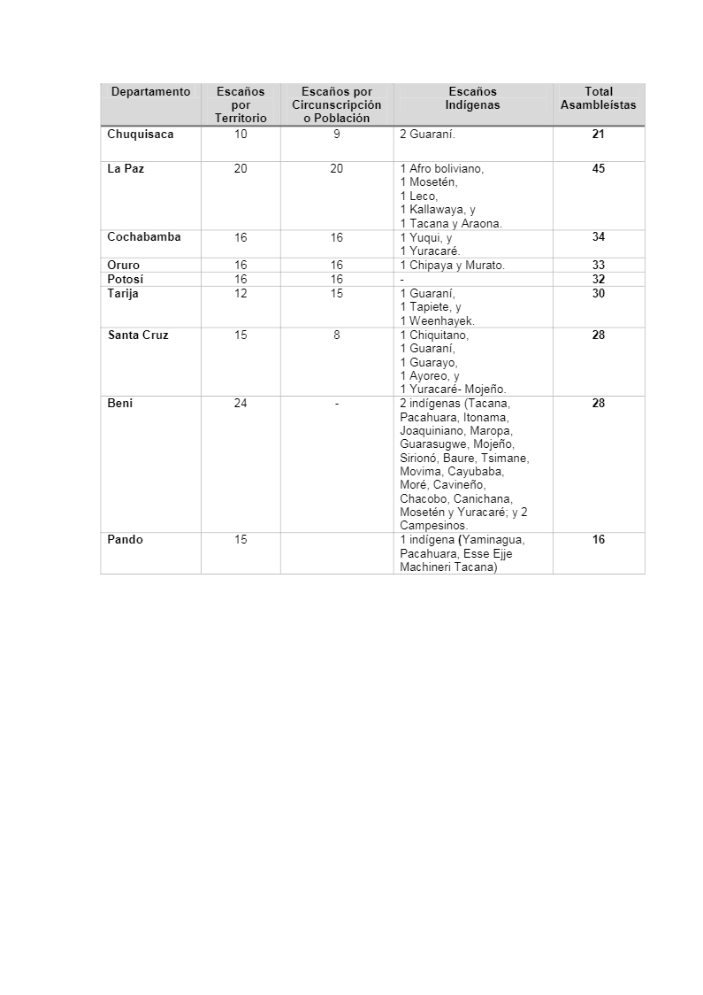 Los escaños para asambleístas departamentales se establecen de acuerdo al siguiente detalle: Chuquisaca 21, La Paz 45, Cochabamba 34, Oruro 33, Potosí 32, Tarija 30, Santa Cruz 28, Beni 28 y Pando 16; distribuidos en escaños por Territorio, por Población e Indígenas.