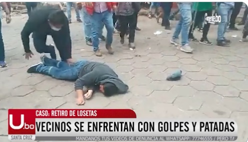 #Urgentebo Ante el retiro de losetas en #SantaCruz, vecinos se enfrentaron con golpes, en la calle #Bolivar. En esta parte del video, se ve como tras una patada un vecino se desmayó.