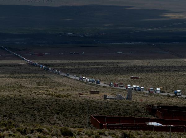13 de enero (Christian Rojas, enviado especial de Urgente.bo).- Entre Tambo Quemado y Chungará, la vista humana no alcanza para dimensionar la enorme fila de camioneros bolivianos que están varados en la carretera, por el lento y agotador trámite chileno para el paso de los transportistas hacia el vecino país. Las curvas y las cimas impiden ver el enorme problema que hoy connacionales, que están agotados del trato que reciben. “Los chilenos nos están humillando, estamos seis días esperando pasar al otro lado”.