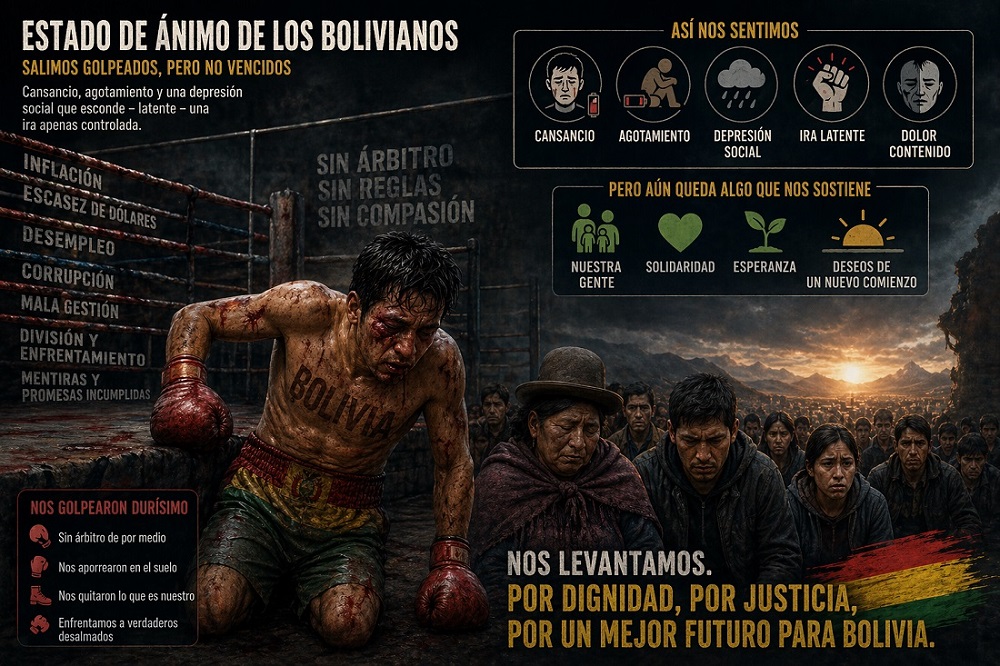 También hay cansancio y agotamiento junto a una depresión social que esconde – latente – una ira apenas controlada. Los bolivianos estamos saliendo de un cuadrilátero donde nos dejaron el rostro inflamado, los ojos reventados y el cuerpo magullado. Nos golpearon durísimo y sin que haya un árbitro de por medio, además, nos aporrearon en el suelo. Enfrentamos a verdaderos desalmados.